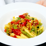 Nel frattempo, una volta cotti gli Spaghetti di grano antico monococco La Pasta di Camerino, versali nella pentola del sugo.